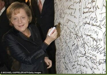 Bà thủ tướng Đức Angela Merkel đang ký chữ ký kỷ niệm trên một mảnh còn lại của bức tường nhân lễ kỷ niệm 20 năm