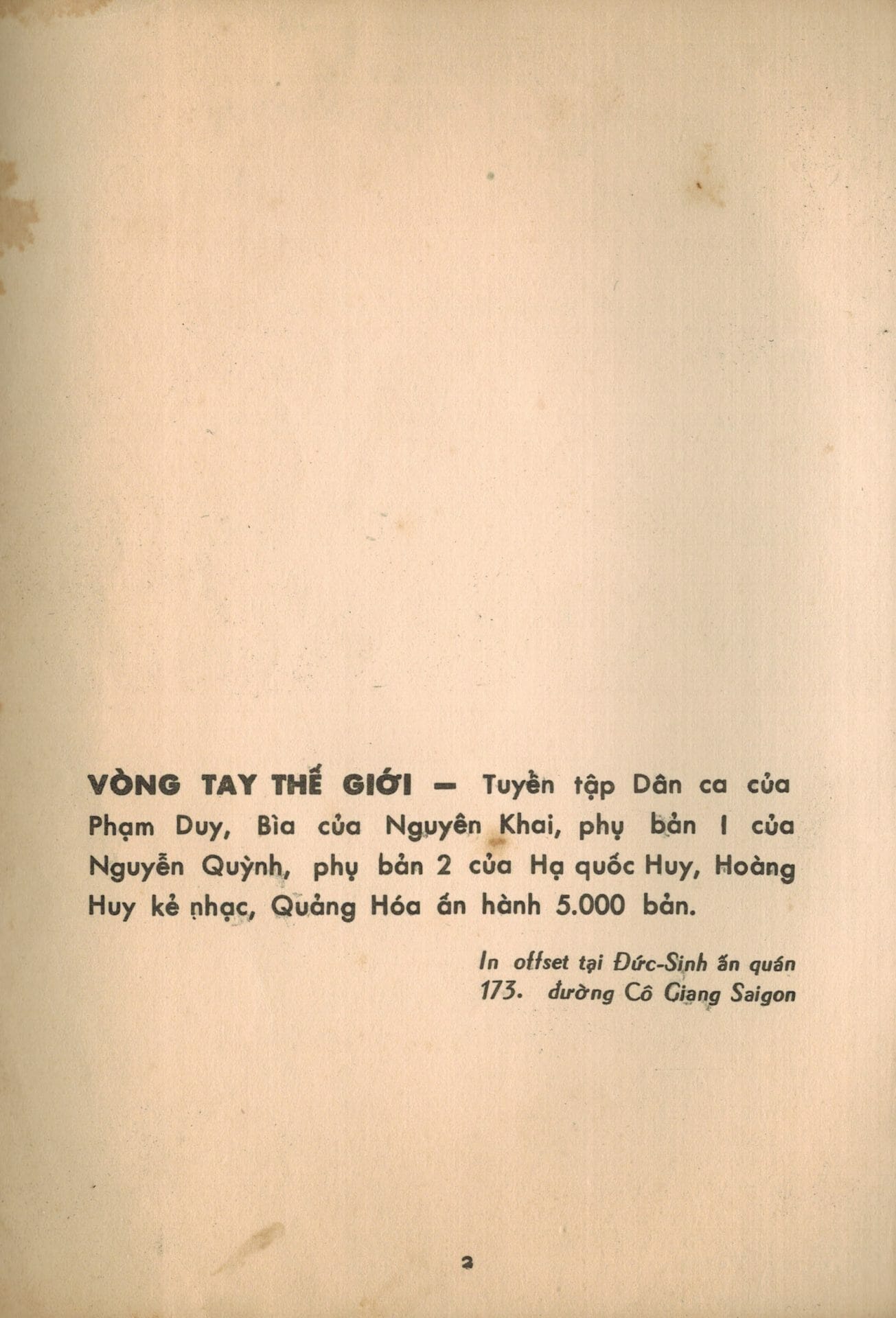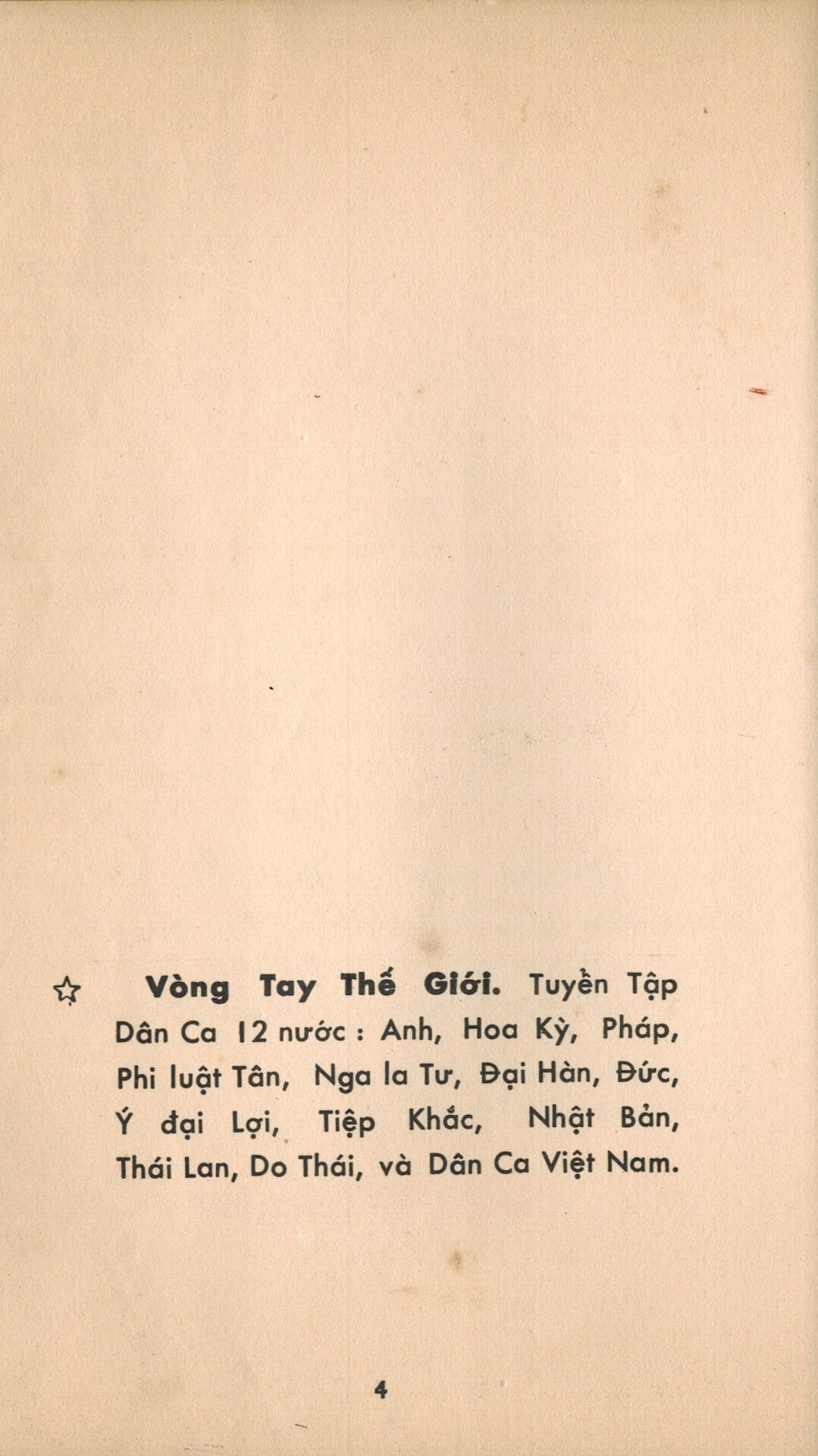 Tuyển tập Dân ca 12 nước “Vòng Tay Thế Giới”  của nhạc sĩ Phạm Duy được nhà xuất bản Quảng Hóa ấn hành năm 1970 dựa phần lớn vào ấn bản năm 1966 mang tên “Dân Ca Folk Songs – Tập tuyển Dân Ca Việt Nam và quốc tế” (xin đọc thêm trong bản chụp Lời Tựa của bản 1970 ở trên).