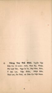 Chúng tôi  cũng đã được xem bản PDF của tập “Dân Ca Folk Songs – Tập tuyển Dân Ca Việt Nam và quốc tế” đăng trên Website của nhạc sĩ Phạm Duy. Nhận xét chung, ngòai nội dung có thêm (và bớt) vài bài của tập xuất bản 1970 so với tập xuất bản 1966, còn có một số bài được/bị đổi tên (chúng tôi sẽ nhắc đến trong phần đi vào chi tiết từng bài). Trong website  Phamduy.com – Trang web lưu giữ di sản âm nhạc của nhạc sĩ Phạm Duy  chúng tôi không thấy có “Tuyển tập Dân ca 12 nước “Vòng Tay Thế Giới” mà chúng tôi sẽ lần lượt giới thiệu trong chuyên mục “Dòng Nhạc Kỷ Niệm” kể từ hôm nay.