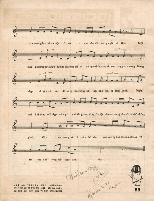 Trong một chuyến về thăm quê nhà gần đây nhất, tôi lại được người Sài Gòn cũ gởi gắm hồn của những người trẻ năm xưa còn sống ở quê nhà. Trẻ năm xưa nhưng nay đã là những ông bà lão tóc hai màu. Dầu vậy, hồn Sài Gòn cũ vẫn như ngày nào trước khi có cuộc đổi đời. Nó không mất, không bị “cải tạo”. Nó vẫn sừng sững tồn tại trong những ấn phẩm văn hóa trước 1975 sống sót qua cuộc phần thư tàn khốc. Nó sống sót được là nhờ ở lòng dân. Nhờ vậy, hôm nay đây tôi may mắn “sở hữu” hồn Sài Gòn ấy qua kho tài sản vô giá: hàng mấy trăm bài nhạc cũ in trước 1975, với thủ bút, chữ ký của các nhạc sĩ tác giả, với cả những hàng chữ viết tay của người chủ sở hữu năm xưa ghi lại kỷ niệm của riêng mình.