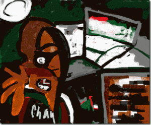 Tranh: Trần Thanh Châu Đang ăn trưa, thời gian không có mấy nên tôi biết tật mình ăn chậm, thì phải ráng nuốt được chút gì hay chút nấy, không dám tham gia vào những chuyện anh em đang bàn tới; có thể là một tin thời sự hay một món ăn mà ai đó
