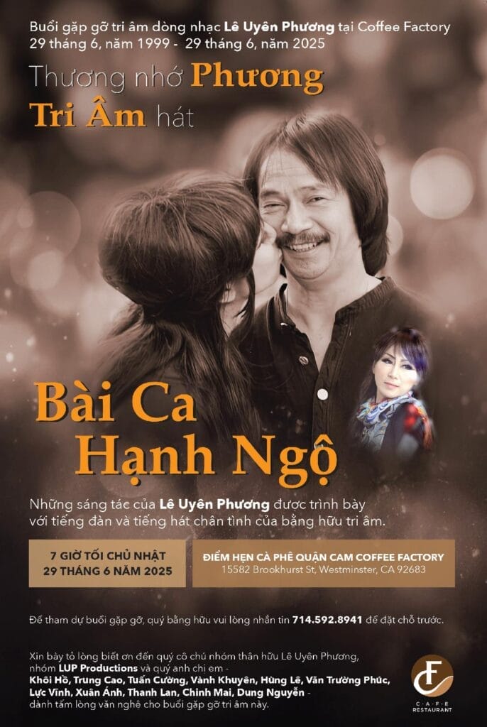 🎶 Buổi gặp mặt sẽ bắt đầu lúc 7 giờ tối và kết thúc lúc 9 giờ tối Chủ Nhật, ngày 29 tháng 6 tại Coffee Factory, 15582 Brookhurst St, Westminster, CA 92683, với chương trình văn nghệ nhỏ dành cho những sáng tác của nhạc sĩ Lê Uyên Phương do các bằng hữu của Coffee Factory và những tâm hồn yêu quý dòng nhạc Lê Uyên Phương trình bày, cùng với sự chuẩn bị âm thanh chuyên nghiệp của Khôi Hồ đến từ San Diego và sự đóng góp tài nghệ của nghệ sĩ tây ban cầm Trung Cao đến từ Virginia. Tất cả các tiết mục dành cho buổi gặp gỡ tri âm dòng nhạc Lê Uyên Phương đều đến từ tấm lòng tự nguyện. Coffee Factory dành riêng không gian âm nhạc cho buổi gặp gỡ tri âm này với lời chúc nghệ sĩ Lê Uyên sớm hồi phục hoàn toàn.