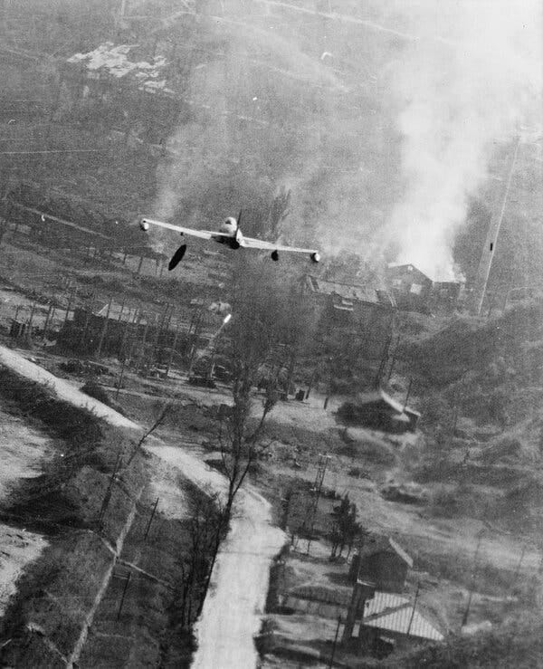 Một máy bay của Không quân Mỹ thả bom napalm xuống một khu vực cách Bình Nhưỡng 35 dặm vào tháng 5 năm 1952.