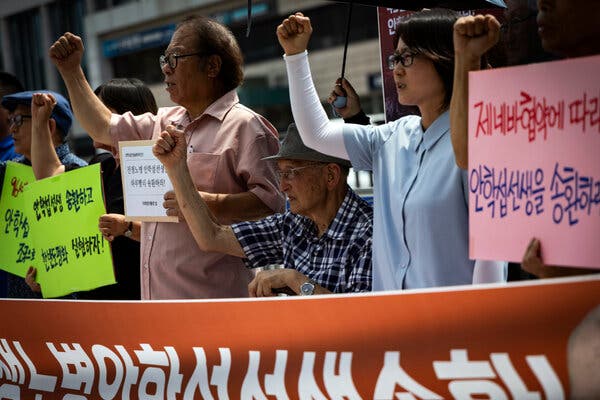 Khi ông xuất hiện trong các cuộc biểu tình tương tự gần các tòa nhà chính phủ vào mùa hè này, những người ủng hộ đã ôm ông, xoa bóp đôi tay viêm khớp của ông và đưa cho ông nước mát cùng một chiếc ô để tránh nóng. Tháng trước, họ đã tổ chức một cuộc tuần hành mang tính biểu tượng đến biên giới để thúc đẩy yêu cầu hồi hương của ông. Ông Ahn tham gia cùng họ với một lá cờ Bắc Triều Tiên. Nhưng cảnh sát đã chặn họ lại trước khi họ có thể đến khu vực cấm.