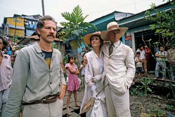 Klaus Kinski và bà Cardinale tại trường quay ở Peru của bộ phim “Fitzcarraldo” (1981). Werner Herzog, đạo diễn của bộ phim, đứng ở phía trước. Ảnh: Jean-Louis Atlan/Sygma, qua Getty Images