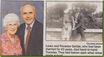 Người chồng tên là Loren Gerber, vợ là Floren Gerbert. Bà vợ thường nói với mọi người rằng tên của chồng bà nằm gọn trong cái tên của bà (F-Loren) như một định mệnh đã gắn chặt họ với nhau 62 năm nay. Quen nhau từ thời còn học chung một trường tiểu học, khi trưởng thành, họ yêu nhau và lấy nhau, có với nhau những đứa con. 62 năm chung sống, có lúc vui, lúc buồn, khi cơm chẳng lành, khi canh chẳng ngọt, nhưng họ vẫn gắn bó với nhau, kể cả trong những giờ ăn trưa khi cả hai còn đi làm, trong những chuyến du lịch khi họ về hưu, và tất nhiên, khi về gìa hai vợ chồng chỉ còn có nhau để nương tựa. Những ngày cuối năm vừa qua, trên đường trở về nhà từ Wichita sau các cuộc viếng thăm con cháu trong thành phố, một tai nạn xe cộ xẩy ra khiến cả hai bị thương nặng, không thể qua khỏi. Họ chỉ sống bằng dưỡng khí nhân tạo, như thực vật. Không muốn cha mẹ kéo dài sự sống như thế, các con của họ quyết định xin bệnh viện tháo bỏ các ống dưỡng khí nhân tạo ấy ra. Những y tá, bác sĩ của bệnh viện St.Francis ở Wichita đã có sáng kiến để hai vợ chồng vào nằm chung một phòng khi thực hiện các thao tác tháo bỏ máy móc trợ sinh. Cả hai trái tim của Loren và Floren ngưng đập cùng một lúc (điều khá hiếm). Tay trái của người chồng nắm chặt lấy tay phải của vợ (như khi họ còn sống mỗi khi ở bên nhau). Các con của họ tin rằng, đó cũng là nguyện vọng của cha mẹ họ. Sống bên nhau và chết bên nhau. Cả hai tránh cho nhau sự đau khổ khi một trong hai người phải ra đi trước. Một câu chuyện tình 62 năm với sự kết thúc tuyệt hảo.