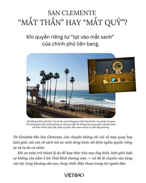 San Clemente không phải là nơi đầu tiên rơi vào tình thế này. Năm ngoái, sau áp lực từ công luận, thành phố Glendale đã chấm dứt hợp tác kéo dài hai thập niên với Bộ Nội An, liên quan đến việc chia sẻ dữ liệu phục vụ các chiến dịch kiểm soát di dân. Cùng thời gian đó, San Diego County vẫn tiếp tục cho phép CBP truy cập cơ sở dữ liệu dân cư thông qua Hiệp Hội Các Chính Quyền Vùng San Diego. Những trường hợp ấy cho thấy, dọc bờ biển Nam California, ranh giới giữa “con mắt thần” liên bang được quảng bá là để canh giữ an ninh biên giới và “con mắt quỷ” lơ lửng trên bầu trời, luôn dõi theo và giám sát đời sống người dân, đang ngày càng trở nên nhòe nhạt.