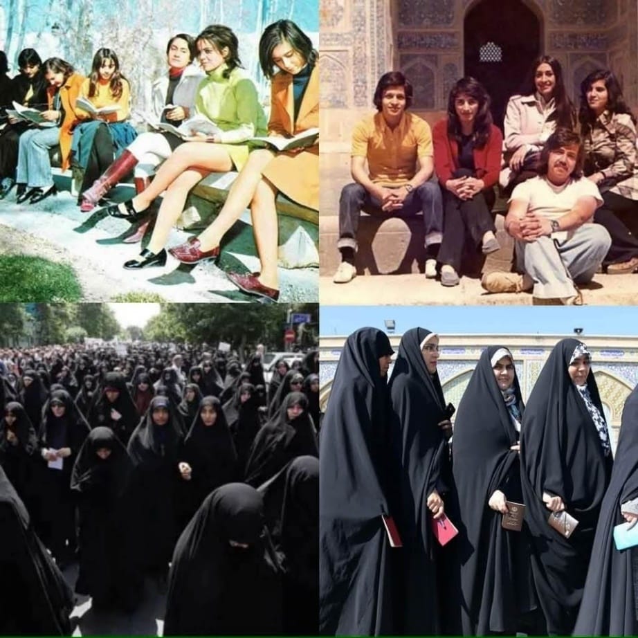 Đúng vậy, bức ảnh bạn chia sẻ là một ví dụ thường thấy được lan truyền để minh họa sự thay đổi sâu sắc trong đời sống xã hội, đặc biệt là vị thế và hình ảnh của phụ nữ Iran, trước và sau Cách mạng Hồi giáo năm 1979.