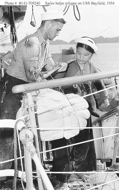 Một thủy thủy đỡ hộ quang gánh cho một người đàn bà di cư đang lên chiến hạm USS Bayfield để được đưa vào Sài Gòn, 3 Tháng Chín, 1954, tại Hải Phòng. (Hình: US Navy Department)