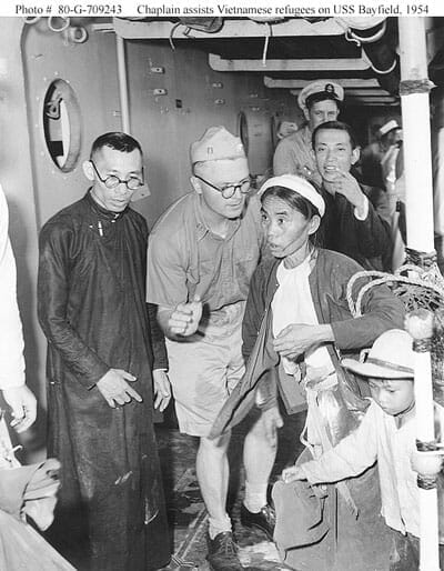 Tuyên Úy Hải Quân Hoa Kỳ, Francis J. Fitzpatrick, giúp phiên dịch cho một phụ nữ di cư trên tàu USS Bayfield, trong cuộc hành trình từ Hải Phòng vào Sài Gòn, Tháng Chín, 1954. (Hình: US Navy Department)