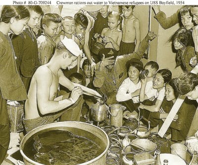 Một thủy thủ trên chiến hạm USS Bayfield chia nước uống cho dân di cư trong cuộc hành trình từ Hải Phòng vào Sài Gòn, Tháng Chín, 1954. (Hình: US Navy Department)