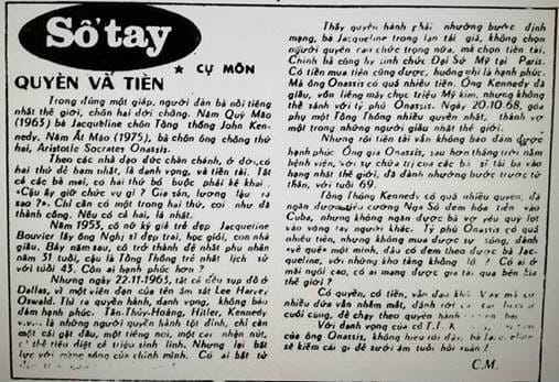 Mục Sổ tay cùng trên số báo đề ngày 19 tháng 3, viết về QUYỀN VÀ TIỀN. Nội dung bài báo đế cập tới trường hợp của cựu Đệ Nhất Phu Nhân Mỹ Jacqueline Kennedy. Chỉ trong một giáp, bà chôn hai ông chồng. Năm Quý Mão (1963) Tổng Thống Kennedy bị ám sát ở tuổi 46. Năm Ất Mão (1975) ông chồng thứ nhì của bà, tỉ phú Onassis qua đời vì bạo bệnh ở tuổi 69.