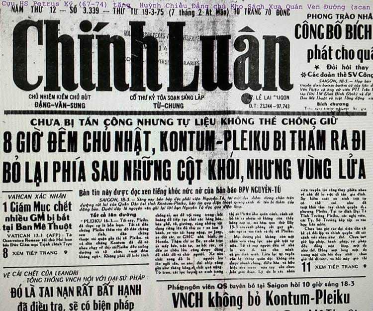 Báo Chính Luận, số đề ngày Thứ Tư, 19-3, 1975, phát hành chiều 18-3. Điều đáng chú ý trong hình trên đây: Tuy quân dân Kontum-Pleiku đã bi thảm ra đi từ đêm 16 tháng 3, đến sáng ngày 18-3, phát ngôn viên quân sự vẫn tuyên bố tại Saigon: VNCH không bỏ Kontum-Pleiku.