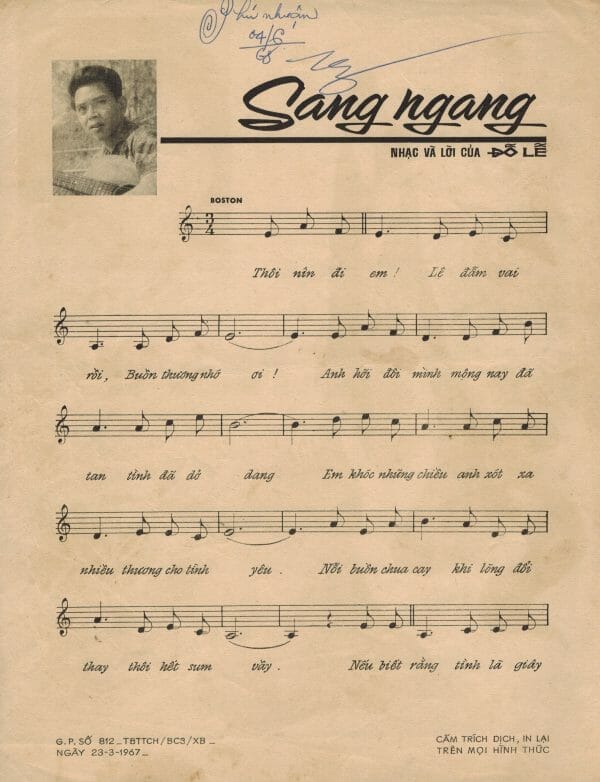 Trong một chuyến về thăm quê nhà gần đây nhất, tôi lại được người Sài Gòn cũ gởi gắm hồn của những người trẻ năm xưa còn sống ở quê nhà. Trẻ năm xưa nhưng nay đã là những ông bà lão tóc hai màu. Dầu vậy, hồn Sài Gòn cũ vẫn như ngày nào trước khi có cuộc đổi đời. Nó không mất, không bị “cải tạo”. Nó vẫn sừng sững tồn tại trong những ấn phẩm văn hóa trước 1975 sống sót qua cuộc phần thư tàn khốc. Nó sống sót được là nhờ ở lòng dân. Nhờ vậy, hôm nay đây tôi may mắn “sở hữu” hồn Sài Gòn ấy qua kho tài sản vô giá: hàng mấy trăm bài nhạc cũ in trước 1975, với thủ bút, chữ ký của các nhạc sĩ tác giả, với cả những hàng chữ viết tay của người chủ sở hữu năm xưa ghi lại kỷ niệm của riêng mình.