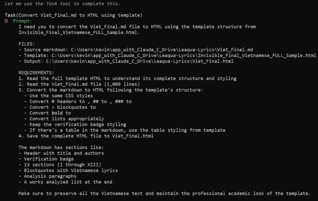 Để kết thúc, Hoctro xin hân hạnh gửi đến các bạn khảo luận “Bản Dịch Vô Hình: Cách Leaqua Tự Nhiên Hóa Cách Diễn Đạt Cảm Xúc Trong Lời Bài Hát Tiếng Việt” do Claude Code viết rồi dịch sang Việt ngữ và làm đẹp với HTML. Hoctro tôi đóng vai “supervisor” để tạo sườn bài, chỉnh sửa nội dung một cách tổng quát: đồng ý với sườn bài, phải viết lối văn dễ hiểu, không viết những từ khó hiểu như “phạm trù”, “giải phóng”, Leaqua là “cô” chứ không phải là “ông”, v.v.