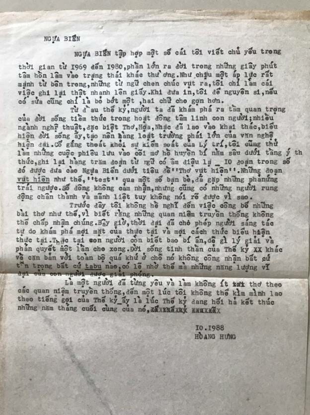 Từ đầu thế kỷ, người ta đã khám phá ra tầm quan trọng của đời sống tiềm thức trong hoạt động tâm linh con người; nhiều ngành nghệ thuật, đặc biệt Thơ, Họa, Nhạc đã lao vào khai thác, biểu hiện đời sống ấy, tạo nên hàng loạt trường phái lớn của văn nghệ hiện đại. Cố thoát khỏi sự kiểm soát của lý trí, tôi cũng thử làm cuộc phiêu lưu vào cõi mơ hồ huyền bí nằm sâu dưới tầng ý thức đó được đưa vào Ngựa Biển dưới tiêu đề “Thơ vụt hiện”. Những đoạn vụt hiện như thế, “test” qua một số bạn bè, đã gặp những phản ứng trái ngược. Số đông không cảm nhận, nhưng có cũng những người rung động chân thành và mãnh liệt tuy không nói rõ được vì sao.