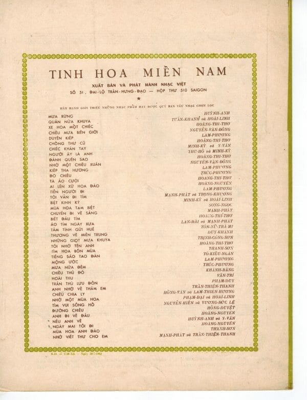 Trong một chuyến về thăm quê nhà gần đây nhất, tôi lại được người Sài Gòn cũ gởi gắm hồn của những người trẻ năm xưa còn sống ở quê nhà. Trẻ năm xưa nhưng nay đã là những ông bà lão tóc hai màu. Dầu vậy, hồn Sài Gòn cũ vẫn như ngày nào trước khi có cuộc đổi đời. Nó không mất, không bị “cải tạo”. Nó vẫn sừng sững tồn tại trong những ấn phẩm văn hóa trước 1975 sống sót qua cuộc phần thư tàn khốc. Nó sống sót được là nhờ ở lòng dân. Nhờ vậy, hôm nay đây tôi may mắn “sở hữu” hồn Sài Gòn ấy qua kho tài sản vô giá: hàng mấy trăm bài nhạc cũ in trước 1975, với thủ bút, chữ ký của các nhạc sĩ tác giả, với cả những hàng chữ viết tay của người chủ sở hữu năm xưa ghi lại kỷ niệm của riêng mình.