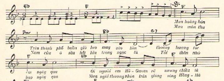 Sau đó, ông tài tình nhắc lại nhạc đề (… heo may vào hồn, thoảng hương tóc em ngày qua,) rồi lèo lái cung nhạc qua những nốt chung với các hợp âm lạ không có trong thang âm Fa trưởng, như Eb, Ab, rồi Db, và cuối cùng đi tới C7 là hợp âm át âm (V7) của Fa trưởng.