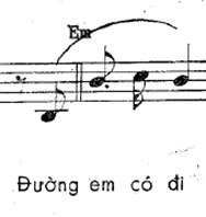 - Thứ hai là chữ “đường” đầu câu rơi vào nhịp thứ nhất, thay vì cuối trường canh như hai đoạn trước. Tuy nhiên nếu để ý ta thấy cái “sườn” vẫn còn đó, bốn chữ “Đường” và ”ngõ đắng cay” vẫn dùng các nốt Si … Si Do Si (B3 B4 C5 B4) chính thực là các nốt của nhạc đề đoạn một.