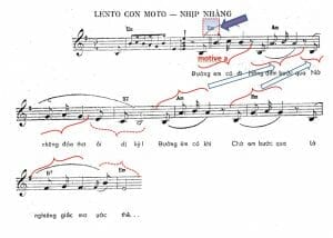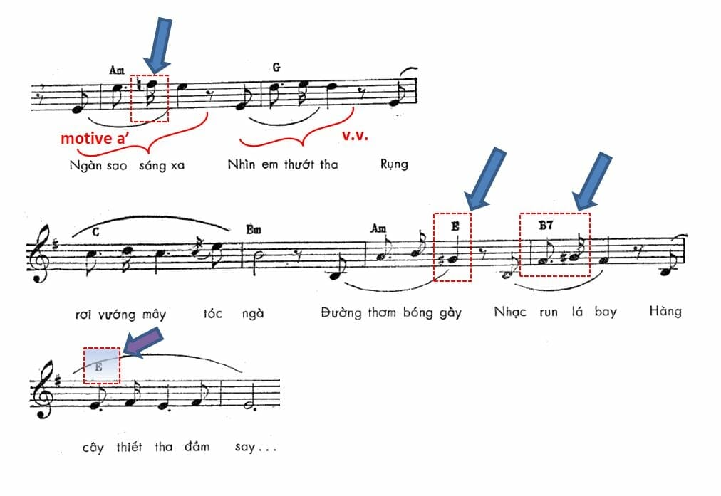 Tới đây, nhạc sĩ mô phỏng nửa câu nhạc đầu bằng cách giữ nguyên tiết tấu cả đoạn, nhưng khéo léo thêm vào nốt Sol thăng ở cuối nhạc đề mới (motive-form) vừa kiến tạo (Đường thơm bóng gầy), rồi lại dùng nốt Fa thăng (của thang âm) để viết tiếp câu kế “nhạc run lá bay”. Câu nhạc có thể dùng hợp âm B7 (V7) để trở về chủ âm Mi trưởng (có ba nốt thăng trong thang âm: Fa#, Do# và Sol#). Từ Mi thứ ở đoạn Một mà chuyển sang Mi trưởng cuối đoạn Hai như vậy, có thể gọi là nhạc cầu kỳ chăng? Lời nhạc đoạn này vẫn rất thơ mộng, tình cảm đã trở nên quyến luyến vì đường đã “thơm bóng gầy” rồi, những cung nhạc do chàng viết ra đã đủ mạnh để làm lá bay, hàng cây giờ đây không còn chỉ có “mơ” nữa mà đã rất “thiết tha” và “đắm say”. Mời bạn xem hình sau với những chỗ chỉ mũi tên để minh họa cho các nhận xét vừa đề cập.