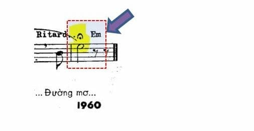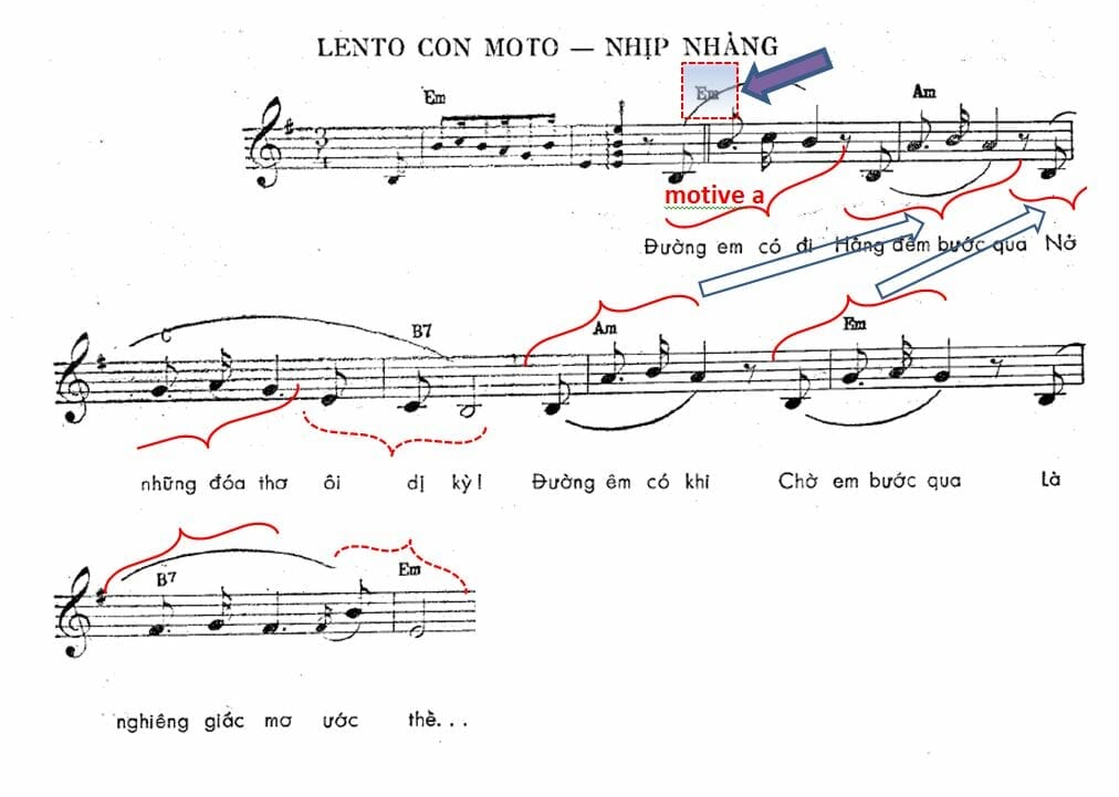 Về hòa âm của đoạn, nhạc sĩ dùng những hợp âm căn bản của âm giai Mi thứ là Em, Am, C, B7. Tóm lại, nhạc và hòa âm rất kinh điển, ý nhạc sáng sủa, theo sát những thành tố cơ bản nhất của một đoạn nhạc là tính logic, mạch lạc, và dễ hiểu. Có một đoạn nhạc một cách “nghiêm chỉnh”, “kinh điển” như vậy mới càng làm nhạc và lời của các đoạn sau thêm phần tương phản. Mời bạn xem hình sau để thấy rõ hơn những điều tôi vừa đề cập.