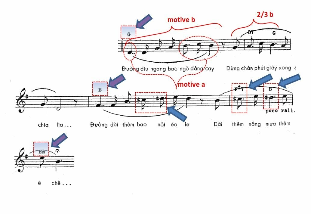 Ngoài việc làm ý nhạc giàu lên với vốn từ (vocabulary) nhiều hơn 7 nốt, nhạc sĩ còn muốn dùng hai nốt Sol# Do#, thuộc về hợp âm B7, với mục đích không gì hơn là quay giai điệu về lại âm giai Mi thứ! Thật vậy, với sự thêm vào hợp âm F#7, là một hợp âm át âm loại hai (secondary dominant) của B7, câu nhạc “dài thêm nắng mưa thêm ê chề” không còn cách nào khác hơn là phải trở về cung Mi thứ, tức là nhạc sĩ đã có thể lặp lại phần nhạc của đoạn Một.