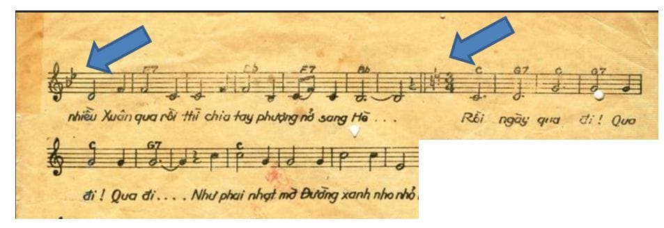 Bạn có thể đọc thêm một vài nhận xét của tôi trước đây về một số nhạc phẩm khác như “Cỏ Hồng”, “Nghìn Trùng Xa Cách”, “Áo Anh Sứt Chỉ Đường Tà” để thấy nhạc sĩ đã sử dụng phép chuyển cung ra sao. Một biến thể khác của lối chuyển cung tinh vi này mà tôi vừa “ngộ” ra là một câu chuyển tiếp trong bài “Ngày Xưa Hoàng Thị”. Sau câu “Xuân qua rồi thì, chia tay phượng nở sang Hè” ở thang âm Si giáng trưởng, nhạc sĩ làm dài câu kế tiếp ra (“Rồi … ngày … qua … đi … qua đi, qua đi …”) cùng lúc bỏ hai dấu giáng một cách thật tự nhiên để đưa giai điệu qua thang âm Do trưởng. Vì ngày tháng qua đi mau, từ “Xuân qua” rồi “phượng nở sang Hè”, “rồi ngày qua đi”, nên chuyển cung từ Bb lên C (cách một quãng hai) quả thật là rất logic, rất khớp lời với nhạc, tạo nên một sinh khí mới. Nhạc sĩ cũng tiếp tục dùng thang âm tới cuối bài chứ không chuyển ngược về cung Si giáng nữa.