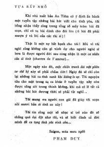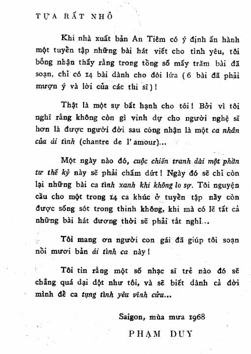“Khi nhà xuất bản An Tiêm có ý định ấn hành một tuyển tập những bài hát viết cho tình yêu, tôi bỗng nhận thấy rằng trong tổng số mấy trăm bài đã soạn, chỉ có 14 bài dành cho đôi lứa (5 bài đã phải mượn ý và lời của các thi sĩ)!