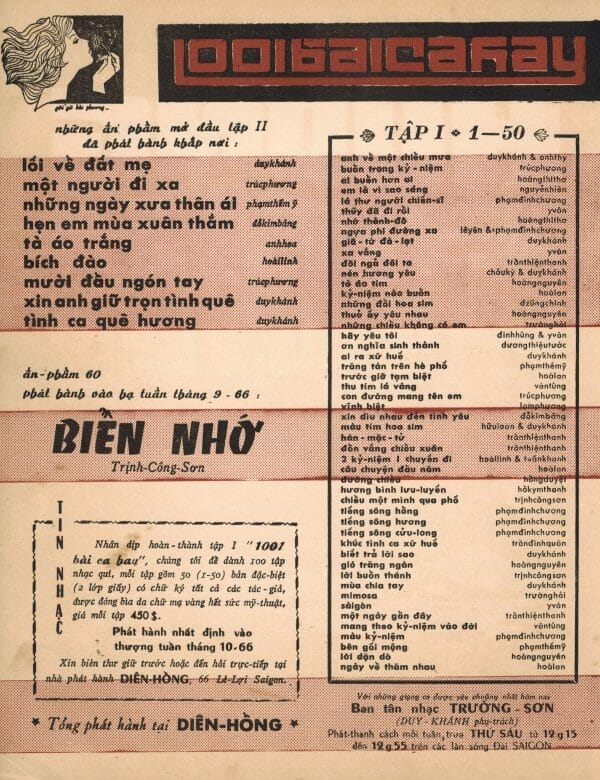 Trong một chuyến về thăm quê nhà gần đây nhất, tôi lại được người Sài Gòn cũ gởi gắm hồn của những người trẻ năm xưa còn sống ở quê nhà. Trẻ năm xưa nhưng nay đã là những ông bà lão tóc hai màu. Dầu vậy, hồn Sài Gòn cũ vẫn như ngày nào trước khi có cuộc đổi đời. Nó không mất, không bị “cải tạo”. Nó vẫn sừng sững tồn tại trong những ấn phẩm văn hóa trước 1975 sống sót qua cuộc phần thư tàn khốc. Nó sống sót được là nhờ ở lòng dân. Nhờ vậy, hôm nay đây tôi may mắn “sở hữu” hồn Sài Gòn ấy qua kho tài sản vô giá: hàng mấy trăm bài nhạc cũ in trước 1975, với thủ bút, chữ ký của các nhạc sĩ tác giả, với cả những hàng chữ viết tay của người chủ sở hữu năm xưa ghi lại kỷ niệm của riêng mình.