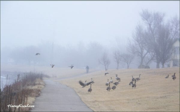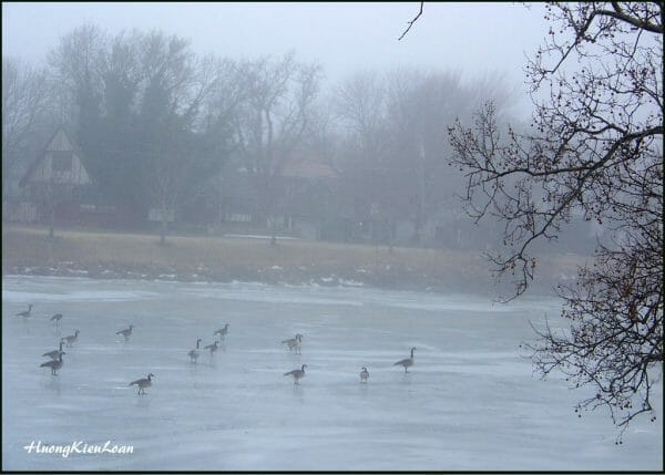 Hôm nay trời vẫn ẩm đục, sương mù trắng như sữa, sương mù phủ xuống con sông quạnh vắng buồn bã như tâm hồn nàng lúc này. Những con ngỗng trời vẫn nằm ngủ yên , trông từ xa giống như những đôi giầy cũ mốc bị bỏ quên… Người ta không nhìn thấy nước, người ta chỉ nhìn thấy một biển sương trắng mỏng mênh mông. Người ta chỉ nhìn thấy không gian như được bao trùm bằng màn voan mỏng mơ màng như tấm aó thần nữ trong những bức danh họa nổi tiếng xa xưa. Nàng tưởng tượng nếu mình được đi trong vùng sương mù đó, ừ nhỉ, nếu mình….