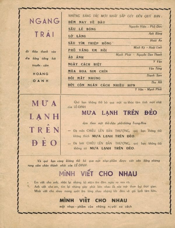 Trong một chuyến về thăm quê nhà gần đây nhất, tôi lại được người Sài Gòn cũ gởi gắm hồn của những người trẻ năm xưa còn sống ở quê nhà. Trẻ năm xưa nhưng nay đã là những ông bà lão tóc hai màu. Dầu vậy, hồn Sài Gòn cũ vẫn như ngày nào trước khi có cuộc đổi đời. Nó không mất, không bị “cải tạo”. Nó vẫn sừng sững tồn tại trong những ấn phẩm văn hóa trước 1975 sống sót qua cuộc phần thư tàn khốc. Nó sống sót được là nhờ ở lòng dân. Nhờ vậy, hôm nay đây tôi may mắn “sở hữu” hồn Sài Gòn ấy qua kho tài sản vô giá: hàng mấy trăm bài nhạc cũ in trước 1975, với thủ bút, chữ ký của các nhạc sĩ tác giả, với cả những hàng chữ viết tay của người chủ sở hữu năm xưa ghi lại kỷ niệm của riêng mình.