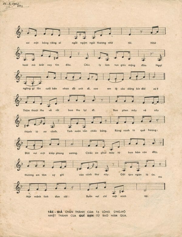 Trong một chuyến về thăm quê nhà gần đây nhất, tôi lại được người Sài Gòn cũ gởi gắm hồn của những người trẻ năm xưa còn sống ở quê nhà. Trẻ năm xưa nhưng nay đã là những ông bà lão tóc hai màu. Dầu vậy, hồn Sài Gòn cũ vẫn như ngày nào trước khi có cuộc đổi đời. Nó không mất, không bị “cải tạo”. Nó vẫn sừng sững tồn tại trong những ấn phẩm văn hóa trước 1975 sống sót qua cuộc phần thư tàn khốc. Nó sống sót được là nhờ ở lòng dân. Nhờ vậy, hôm nay đây tôi may mắn “sở hữu” hồn Sài Gòn ấy qua kho tài sản vô giá: hàng mấy trăm bài nhạc cũ in trước 1975, với thủ bút, chữ ký của các nhạc sĩ tác giả, với cả những hàng chữ viết tay của người chủ sở hữu năm xưa ghi lại kỷ niệm của riêng mình.