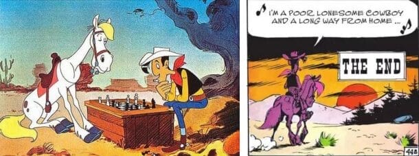 Phần kết mỗi tập truyện đều có cùng mẫu số chung, tranh cuối cùng bao giờ cũng là hình ảnh chàng Lucky Luke vẫn một mình một ngựa, cưỡi trên lưng chú Jolly Jumper vừa lững thững đi về phía mặt trời lặn vừa hát nghêu ngao, “Tôi là gã cao-bồi nghèo đơn độc, mà quê nhà thì xa quá xa…” (I’m a poor lonesome cowboy / and a long way from home…)