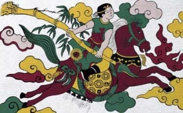Nếu trong huyền sử nước Anh có câu chuyện nàng Godiva cưỡi ngựa trong trang phục Eva thì trong huyền sử Việt cũng có câu chuyện Phù Đổng Thiên Vương (hay Thánh Gióng) cưỡi con ngựa sắt thật ly kỳ. Tương truyền, đời vua Hùng Vương thứ sáu, nhà Ân xua quân xâm lấn nước Văn Lang. Vua lo lắng, sai người đi khắp nơi tìm nhân tài ra cứu nước. Khi đến làng Gióng, xã Phù Đổng tỉnh Bắc Ninh, gặp cậu bé lên 3 tuổi, nói với sứ giả “Ngươi về tâu với đức Vua đúc cho ta con ngựa sắt, áo giáp sắt và roi sắt để ta đi đánh giặc Ân”. Vua lấy làm lạ nhưng cũng đáp ứng mọi yêu cầu. Khi có đủ mọi thứ, cậu bé vươn vai biến thành chàng trai cao lớn, nhảy phóc lên lưng ngựa sắt. Ngựa hí vang lộng, thét ra lửa, lao vút ra trận. Bọn giặc hoảng loạn giẫm đạp lên nhau chạy trối chết. Roi sắt gãy, chàng trai nhổ từng bụi tre quất tơi bời lũ giặc. Sau khi truy đuổi giặc đến chân núi Sóc Sơn, ngựa và người bay thẳng lên trời mất dạng.