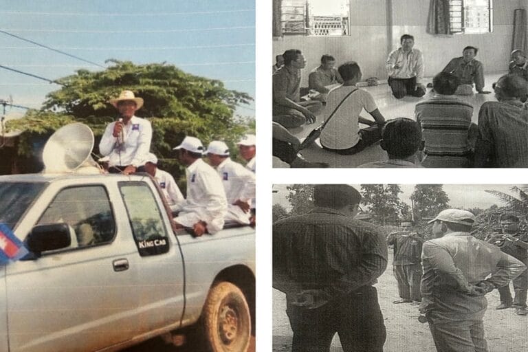 Trong một bức ảnh, ông đang đứng ở phía sau một chiếc xe bán tải màu trắng, một chiếc loa phóng thanh trước mặt và lá cờ Campuchia xanh, đỏ, trắng đang tung bay từ cửa sổ bên tài xế. Trong một bức khác, ông đang quỳ trên sàn bê tông với hàng chục người dân làng, giúp họ lên kế hoạch cho một cuộc bầu cử sắp tới.