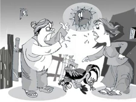 “…Bốn thằng cầm cờ xanh đứng đầu ngõ, ba thằng cờ đỏ đứng đầu làng, đưa đám tang cả nhà mày ra đồng làng chôn đấy. Mày có khôn hồn mang trả ngay con gà đó cho tao, kẻo không tao đào mồ, quật mả cao tầng tổ khảo, cao tằng tố tỉ, thúc, bá, huynh, đệ, cô, dì, tỉ muội nhà mày đấy…”.
