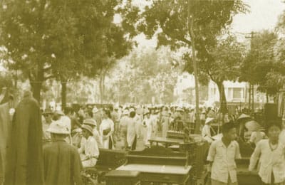 Chợ Trời ở đường Hồ Xuân Hương gần hồ Thuyền Quang, nơi dân chúng chuẩn bị di cư bán đi các đồ đạc trong nhà, là khu vực đông đảo nhất Hà Nội vào Tháng Tám, 1954. (Hình: Hà Tường Cát)