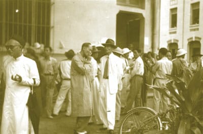 Bố tôi (quần áo trắng đội mũ) đứng chờ danh sách di cư vào Nam tại sở học chính Bắc Việt, Hà Nội, cuối Tháng Bảy, 1954. (Hình: Hà Tường Cát)
