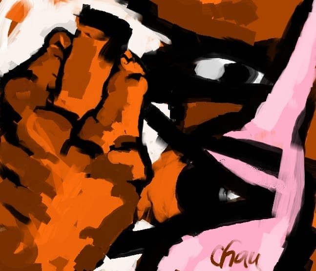Từng vết kim một. Rồi từng vết kim một như những vết khắc. Mặt trời lay láy rọi vào căn phòng tám chiếu như muốn đốt cháy tấm lưng của bà. Bà cắn răng, không vật vã, không một giọt nước mắt. Trong sư đem cả tâm hồn nghệ thuật vị nhân sinh vào từng đường nét chấm phá. Từng giọt máu, từng giọt máu hòa lẫn với mầu sắc đen, đỏ của tác phẩm vờn nhau nhẩy múa…Trời quá ngọ từ lúc nào, sư cứ mải miết chẳng hay. Mái tóc bà điên loạn xổ tung xuống hai gò má. Nhưng hai bờ vai chịu đựng chẳng mảy may động đậy. Dồn hết tâm ý vào một chữ to đậm, mặt sư trắng bệch rồi tái dần, chuyển qua xanh nhạt, xanh như đít nhái. Trong sư trống rỗng như có một lỗ hổng lớn và sư cũng chẳng biết là gì. Sư cứ mải miết, quên đi những thống khoái khi hành hạ những thí chủ khác mấy năm nay. Có một lúc chân tay da thịt đụng chạm qua xát, xoa, lăn, vê. Sư bị bấn loạn, bị đẩy vào giữa cõi ta bà và thế tục. Giữa cái thực và cái ảo. Trong não bộ sứt mẻ sư nóng hổi với cuồng si với sự sống, da thịt đàn bà, cõi trần tục, cõi cực lạc. Sư đắm chìm trong tình cuồng qua những đường nét mạnh vũ bão như những nhát kiếm. Kỳ nhân này là một thi sĩ ẩn mình trong áo nâu sòng của một nhà sư, thế nên ngay lúc này, trong sư cũng đang ẩn hiện những dòng thơ bất chợt: