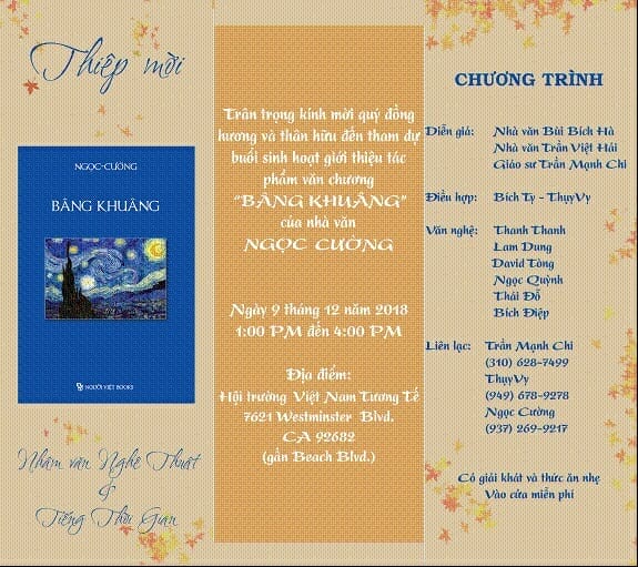 Xin trân trọng giới thiệu buổi RMS tác phẩm “Bâng Khuâng” của nhà văn Ngọc Cường đến quý độc giả cư ngụ ở miền Nam California.