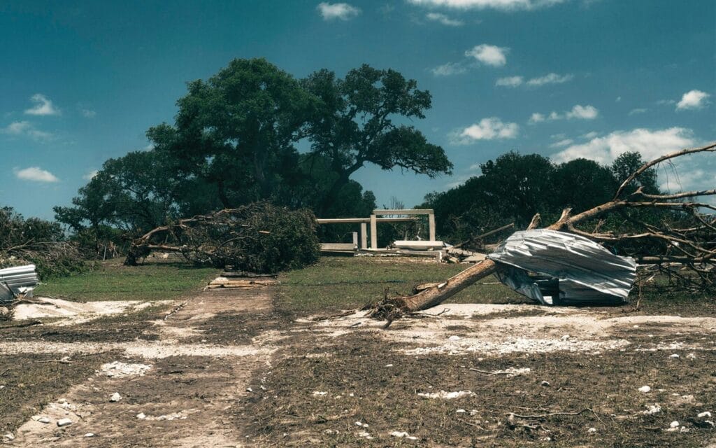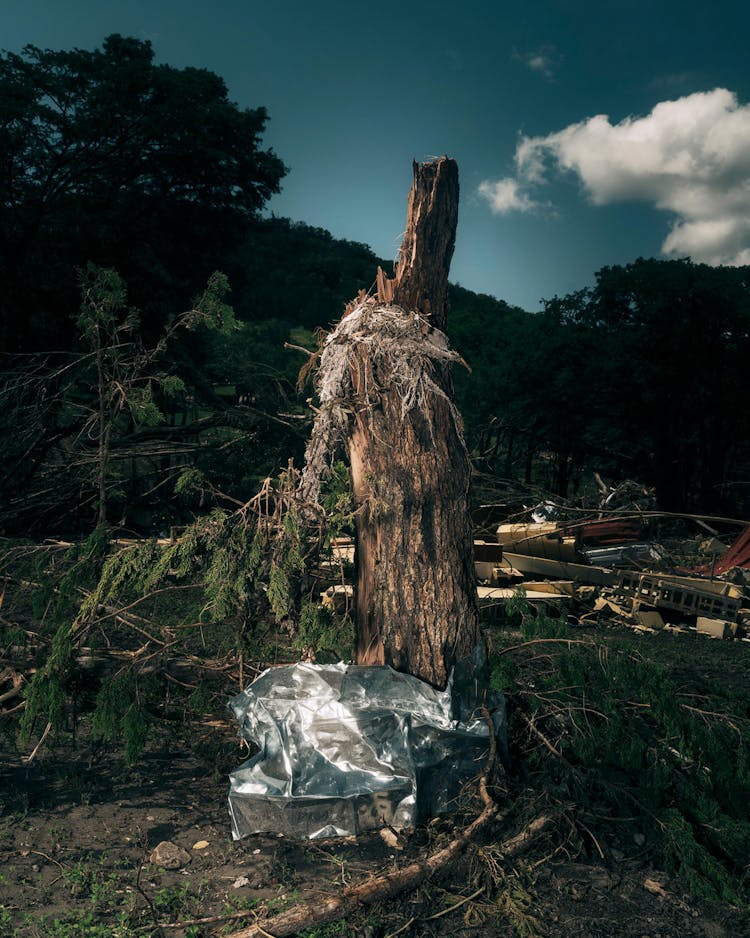 Hình ảnh: Tàn tích của một cái cây bao quanh bởi mảnh vỡ và các phần của ngôi nhà sông. (Ảnh: Jordan Vonderhaar)