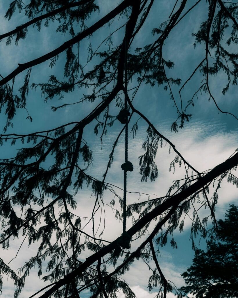 Hình ảnh: Xích đu dây treo trên cây gần ngôi nhà sông giữa đống đổ nát. (Ảnh: Jordan Vonderhaar)