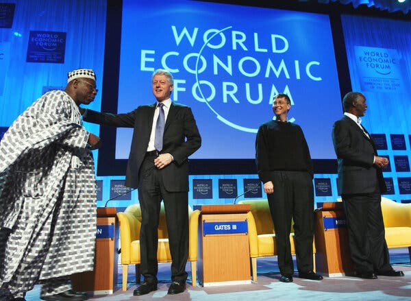 (Hình ảnh): Bill Gates tại Diễn đàn Kinh tế Thế giới 2005, cùng với các Tổng thống Nigeria, Nam Phi và cựu Tổng thống Bill Clinton.