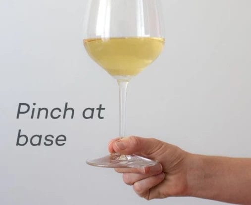 3. Pinch at base: Dùng ngón cái và ngón trỏ để cầm chân ly, ngay phần giao điểm với đế. Các ngón khác đỡ dưới đế ly.