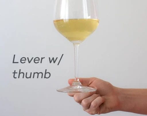 4. Lever with thumb: Dùng bốn ngón: trỏ, giữa, đeo nhẫn và út để đỡ bên dưới đế ly. Dùng ngón cái – bên trên – để kẹp đế ly lại với 4 ngón nằm dưới.