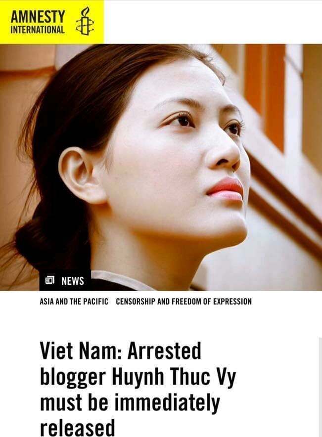 Ngay sau khi có thông tin blogger Huỳnh Thục Vy bị nhà cầm quyền bắt giữ, Tổ Chức Ân Xá Quốc Tế kêu gọi nhà cầm quyền trả tự do cho bà Vy ngay lập tức và vô điều kiện. Bà Clare Algar, Giám đốc Chương trình Toàn cầu của Ân xá quốc tế nói “Vụ bắt giữ này không gì khác hơn vì động cơ chính trị muốn bịt miệng một trong những tiếng nói cổ vũ mạnh mẽ nhất nhân quyền tại Việt Nam.. .”