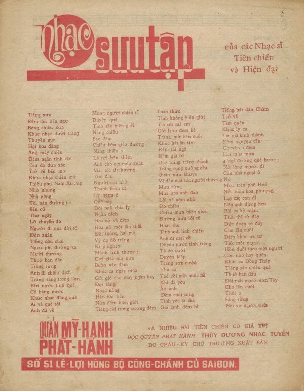 Trong một chuyến về thăm quê nhà gần đây nhất, tôi lại được người Sài Gòn cũ gởi gắm hồn của những người trẻ năm xưa còn sống ở quê nhà. Trẻ năm xưa nhưng nay đã là những ông bà lão tóc hai màu. Dầu vậy, hồn Sài Gòn cũ vẫn như ngày nào trước khi có cuộc đổi đời. Nó không mất, không bị “cải tạo”. Nó vẫn sừng sững tồn tại trong những ấn phẩm văn hóa trước 1975 sống sót qua cuộc phần thư tàn khốc. Nó sống sót được là nhờ ở lòng dân. Nhờ vậy, hôm nay đây tôi may mắn “sở hữu” hồn Sài Gòn ấy qua kho tài sản vô giá: hàng mấy trăm bài nhạc cũ in trước 1975, với thủ bút, chữ ký của các nhạc sĩ tác giả, với cả những hàng chữ viết tay của người chủ sở hữu năm xưa ghi lại kỷ niệm của riêng mình.