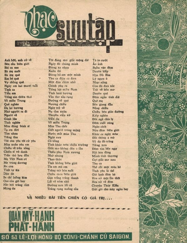 Trong một chuyến về thăm quê nhà gần đây nhất, tôi lại được người Sài Gòn cũ gởi gắm hồn của những người trẻ năm xưa còn sống ở quê nhà. Trẻ năm xưa nhưng nay đã là những ông bà lão tóc hai màu. Dầu vậy, hồn Sài Gòn cũ vẫn như ngày nào trước khi có cuộc đổi đời. Nó không mất, không bị “cải tạo”. Nó vẫn sừng sững tồn tại trong những ấn phẩm văn hóa trước 1975 sống sót qua cuộc phần thư tàn khốc. Nó sống sót được là nhờ ở lòng dân. Nhờ vậy, hôm nay đây tôi may mắn “sở hữu” hồn Sài Gòn ấy qua kho tài sản vô giá: hàng mấy trăm bài nhạc cũ in trước 1975, với thủ bút, chữ ký của các nhạc sĩ tác giả, với cả những hàng chữ viết tay của người chủ sở hữu năm xưa ghi lại kỷ niệm của riêng mình.