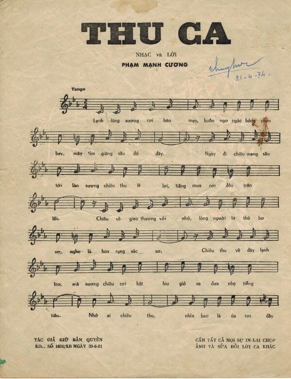 Tôi xem lại tập nhạc “Tình Khúc Phạm Mạnh Cương”, xuất bản năm 2007, do chính tác giả ở Montreal gởi tặng với dòng chữ còn chưa run và đặc biệt, tuy Ông đã ngoài 70 tuổi. Tập nhạc gồm 26 tình khúc, nhắc nhớ những bài mà tôi còn nhớ rất rõ như Thu Ca, Thương Hoài Ngàn Năm, Thung Lũng Hồng, Tình Yêu Đã Mất … Xem kỹ hơn nữa thì thấy mùa Thu “ẩn hiện” trong nhiều tác phẩm của Ông: rõ ràng như qua tựa đề các bản nhạc: Thu Ca, Thu Về Trong Mắt Em, Mùa Thu Không Có Em … hay thấp thoáng đó đây trong lời của các bản nhạc sau: