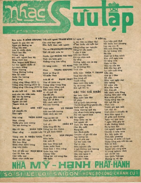 Trong một chuyến về thăm quê nhà gần đây nhất, tôi lại được người Sài Gòn cũ gởi gắm hồn của những người trẻ năm xưa còn sống ở quê nhà. Trẻ năm xưa nhưng nay đã là những ông bà lão tóc hai màu. Dầu vậy, hồn Sài Gòn cũ vẫn như ngày nào trước khi có cuộc đổi đời. Nó không mất, không bị “cải tạo”. Nó vẫn sừng sững tồn tại trong những ấn phẩm văn hóa trước 1975 sống sót qua cuộc phần thư tàn khốc. Nó sống sót được là nhờ ở lòng dân. Nhờ vậy, hôm nay đây tôi may mắn “sở hữu” hồn Sài Gòn ấy qua kho tài sản vô giá: hàng mấy trăm bài nhạc cũ in trước 1975, với thủ bút, chữ ký của các nhạc sĩ tác giả, với cả những hàng chữ viết tay của người chủ sở hữu năm xưa ghi lại kỷ niệm của riêng mình.